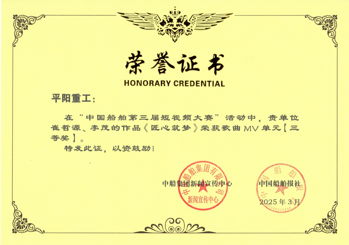 近日(ri),公司多項新(xin)(xin)聞(wen)(wen)(wen)宣(xuan)傳工(gong)作榮獲集團公司第二十九屆(jie)(jie)船舶新(xin)(xin)聞(wen)(wen)(wen)獎(jiang)、第十八屆(jie)(jie)船舶新(xin)(xin)聞(wen)(wen)(wen)先(xian)進(優秀)企業(ye)報刊、第三(san)屆(jie)(jie)短視(shi)頻大賽獎(jiang)項。